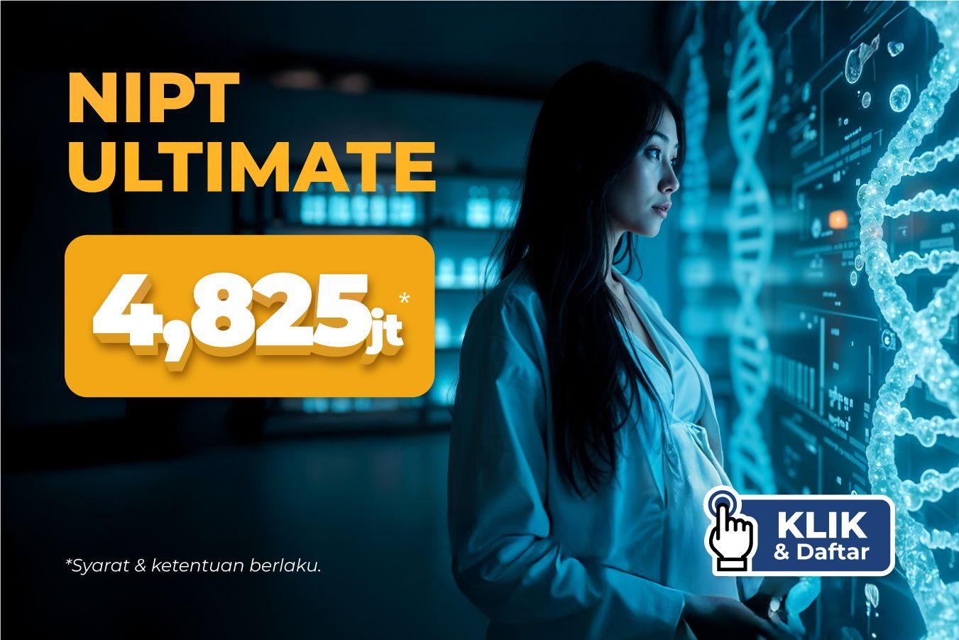 Layanan skrining untuk mendeteksi kondisi genetik T21, T18, T13, T9, T16, T22, SCA, 92 CNV, Temuan incidental/aneuploidi kromosom lainnya dan CNV ≥5 Mb, Fetal sex